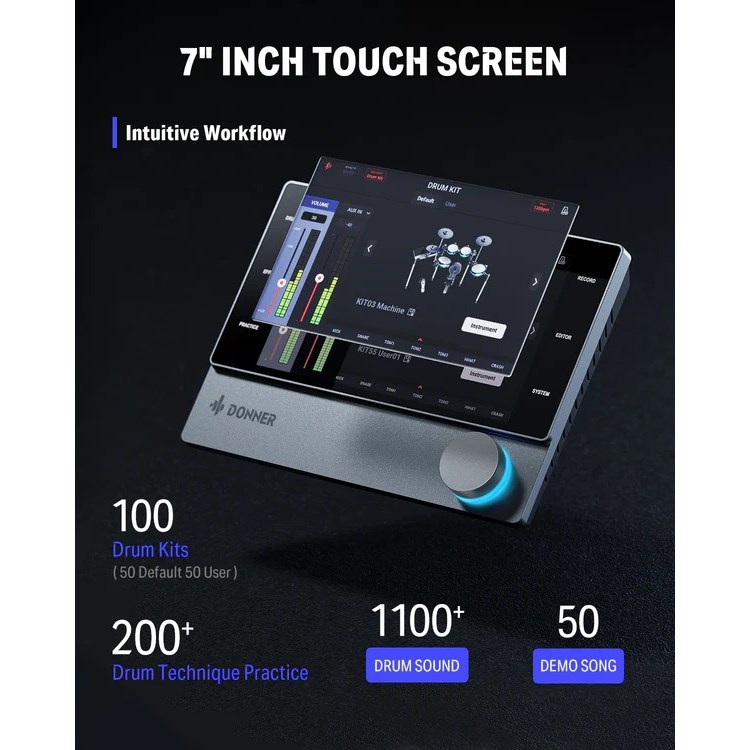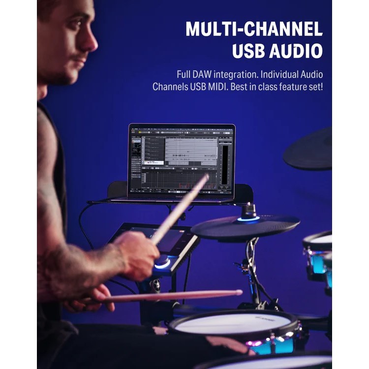 Bu birinci sınıf kit, maksimum kontrol için çift pedalla uyumlu sağlam bir kick pad'e sahiptir. Dört dual-zone mesh davul pedi ve jikle özelliğine sahip üç çift bölgeli zil ile dinamik çalmanın keyfini çıkarın.