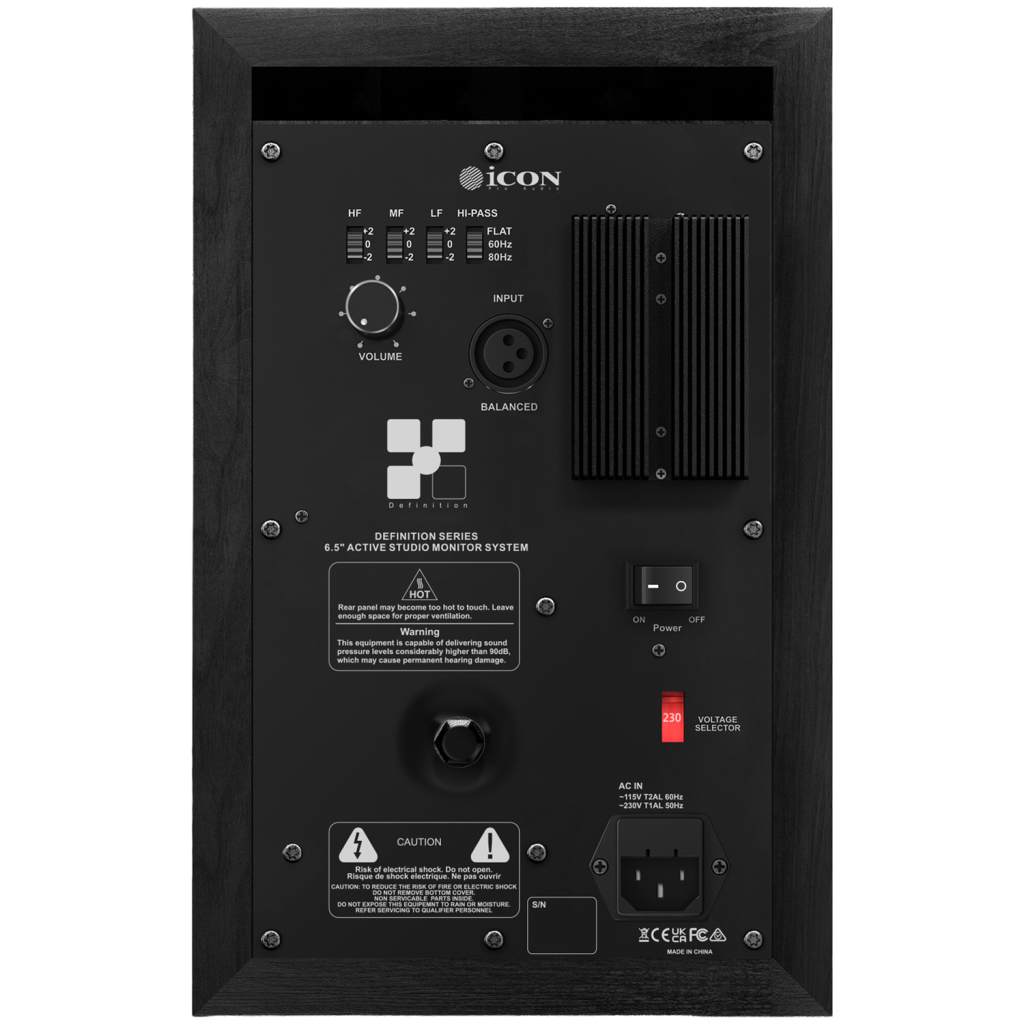 Arka panelde, hem woofer'a hem de tweeter'a özel güç sağlayan dahili Bi-Amp güç modülüne bağlanan bir XLR girişi bulunur. Ayrıca, ses seviyesi enkoderi ve Hi (Tiz), Mid (Orta) ve Low (Bas) varlık (presence) anahtarlarını içeren, kullanımı kolay bir preamfi bölümü mevcuttur. Bu yenilikçi kontroller, sesi şekillendirmenize ve monitörleri odanıza veya tercihinize göre ayarlamanıza olanak tanır; geleneksel hi-fi sesinden düz ve doğru tepkiye kadar, daha agresif bir ses profili için iki ek seviye mevcuttur.
